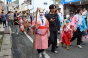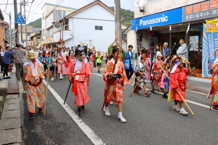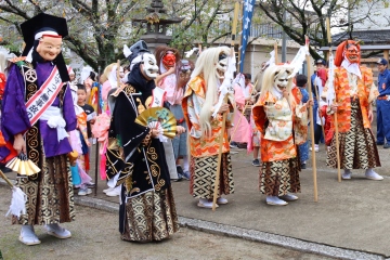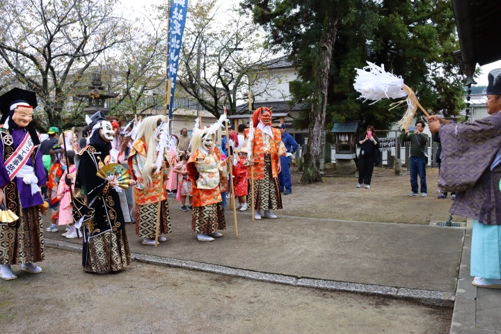 行列は午後1時過ぎに向町を出発。素戔鳴尊命に扮した井原警察署長を先頭に鏡獅子太鼓や鬼の山車、町内から集まった鬼の集団らがこれらに続き、一行は同3時ごろ2km南の郷社足次山神社へ到着。