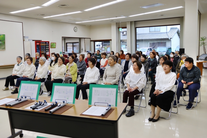 冒頭、開会挨拶で野宮代表は令和3年、認知症予防などを目標に立ち上げた若返り教室の活動内容を紹介。普段はつどえ~るや高屋公民館で歌やトーンチャイムの演奏を楽しんでおり「多くの人たちが音楽を健康づくりに役立ててほしい」と企画したものです。