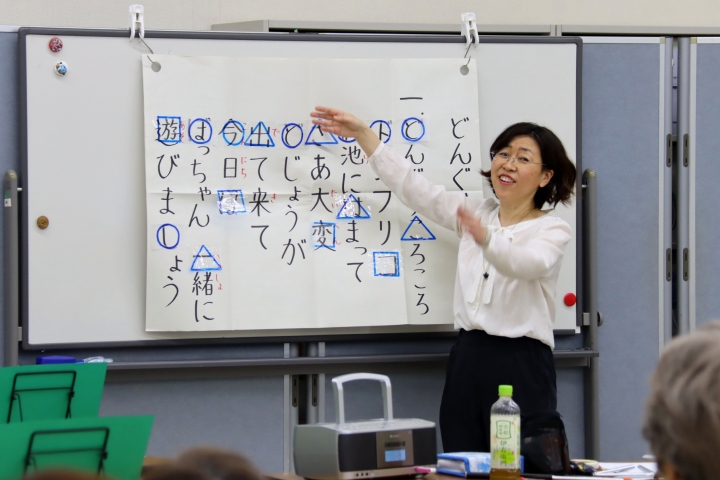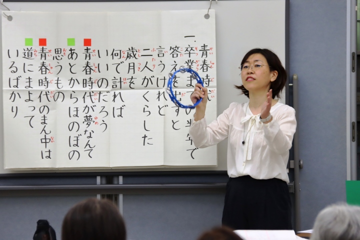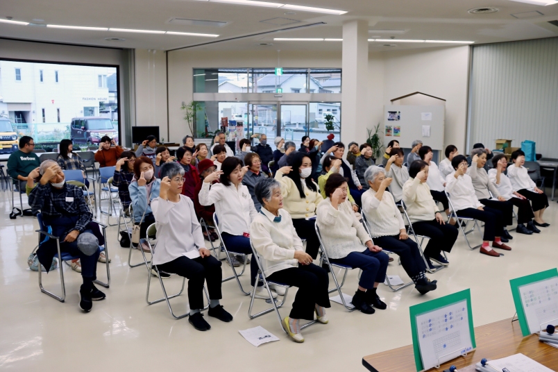 体験はリラックス効果のある口で吐いて鼻から吸う呼吸法と、血流を良くするあいうべ体操からスタートし、歌の部門に入りました。最初の「ちいさい秋みつけた」では途中、指文字の手話を交える場面があり、思わず笑いが。
