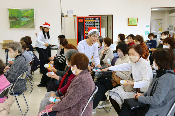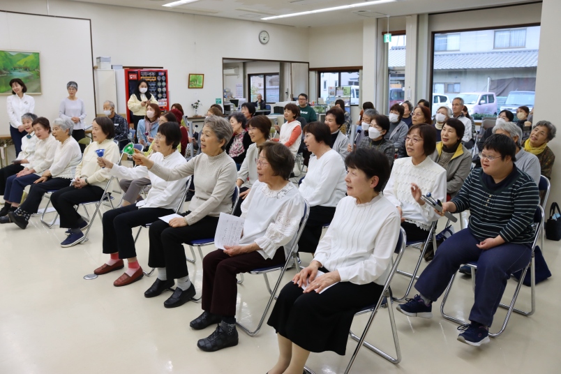 懐かしい歌謡曲合唱では昭和47年に流行った「学生街の喫茶店」、ペギー葉山が歌った「学生時代」、さらに「高校三年生」と続き、最後の「青春時代」では簡易楽器を鳴らし盛り上がりました。