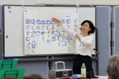 今回の講師は鳥越裕子氏と堀之内まい氏の二人。最初は鳥越氏が口話学習が主流だった頃から今日の手話に至る経緯等について説明。続いて「おはよう」「こんにちは」などの挨拶や「そうそう」「覚えた」「忘れた」「また会いましょう」といった日常会話を手話でどのように表現するか皆で復習しました。