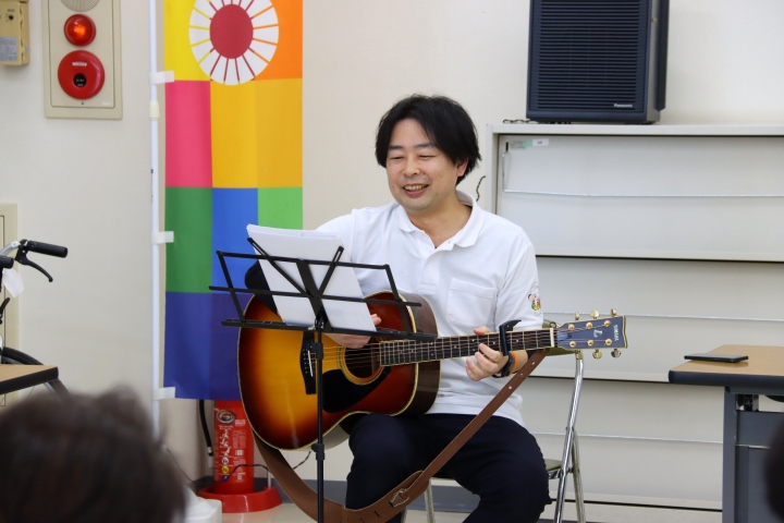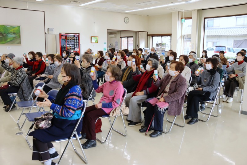 プログラム1番は口や舌の筋肉を鍛え、誤嚥防止につながると言われているパタカラ体操を「みかんの花咲く丘」の曲に合わせて歌唱。続いて童謡唱歌「夏は来ぬ」や「南国土佐を後にして」、「上を向いて歩こう」など、かつてヒットした歌謡曲を歌ったり、歌体操や手作りマラカスで合奏したりしました。