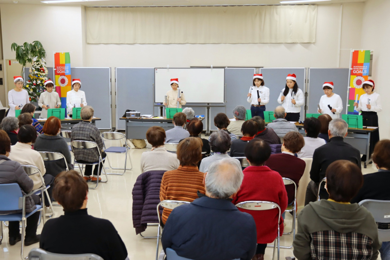 師走にクリスマスソングを届けようとつどえ~るで12月20日、音楽療法で若返り教室がトーンチャイムコンサートを開きました。