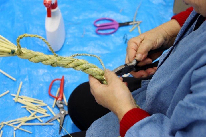 会場には4枚のブルーシートが敷かれ、事前に申し込んだ45人はメガネ形しめ飾りとリース形しめ飾りの二班に分かれて座り、青田刈りをして用意された稲ワラなどを受け取って午前9時30分から作業を開始。