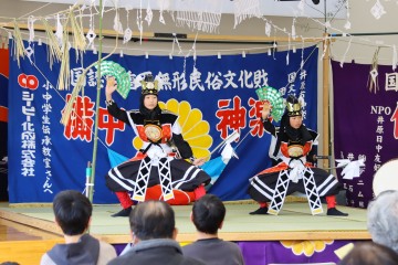 演目(1部)に移り、阿南湊叶君・廣安伶翼君・池田宗一郎君・小田原稜実君による導きの舞いに始まり、生徒らは猿田彦の命舞・大国主の命舞・事代主の命舞・国譲りの舞(鬼退治)・素戔嗚尊の命舞(大蛇退治)を披露。大人顔負けの勇壮な舞いと太鼓の響きは正午まで続き、午後からは迫力ある第2部も演じられ、神楽ファンを楽しませました。