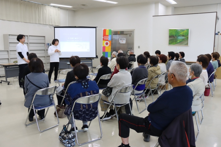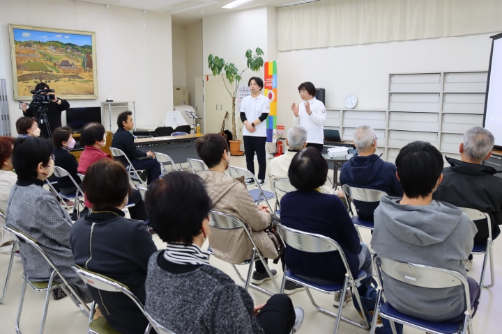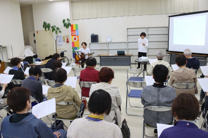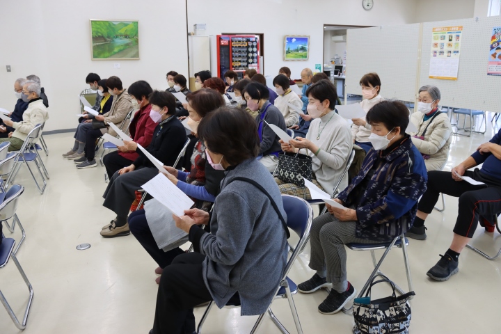 音楽療法で若返り教室(野宮弘恵代表・会員40人)がつどえ~るで5月31日、無料公開講座を開催し52人が参加しました。