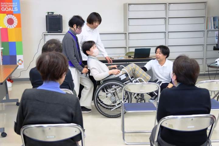 「まさかの事態に備えよう 何でも知っておくと便利」のコーナーでは、車椅子の使い方も体験しました。